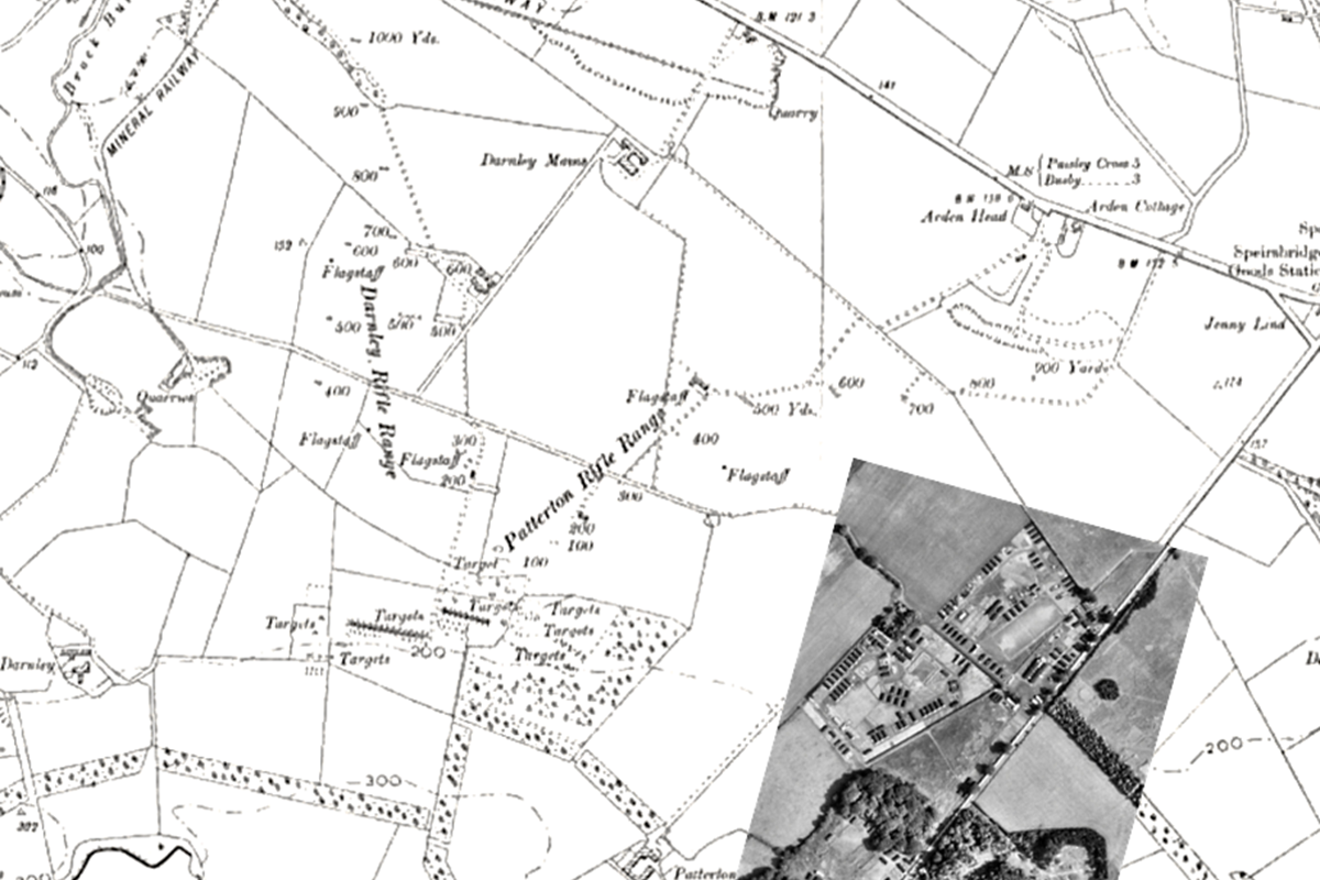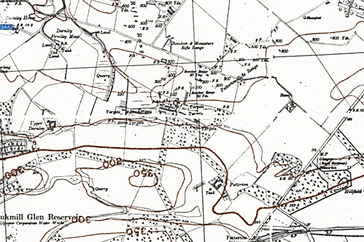 Prior to the outbreak of WWII, Patterton was a largely rural area near Thornliebank, Scotland; its few dwellings mainly facilitated farming, small-scale quarrying and transport activities. The area close to what later became Patterton Prisoner of War (POW) Camp housed two neighbouring rifle ranges. These were the Patterton Rifle Range and the Darnley Rifle Range, which were opened in the 1870s and the 1880s respectively. They first appear on the 1896-1899 ordinance survey (OS) map (second edition, first revision) and seem to have been most active on the OS map third edition (1914-1920), when army and territorial forces were preparing for WWI, the ‘Irish question’, and the following period of post-war industrial and social unrest. The rent books of the Nether Pollok Estate show that the rifle ranges were being rented by the Territorial Force from 1909 to 1922. There are no rent entries for the ranges after that, which suggests, as aerial photographs indicate, that the ranges fell out of use for a time. The ranges look to have fallen out of or perhaps diminished in use by the OS map 4th edition (1934-1938). However, our respondent, James Rodger (c.90 years of age), thinks that they were being used in the late 1930s for rifle practice, at the time when Britain was again preparing for war:
