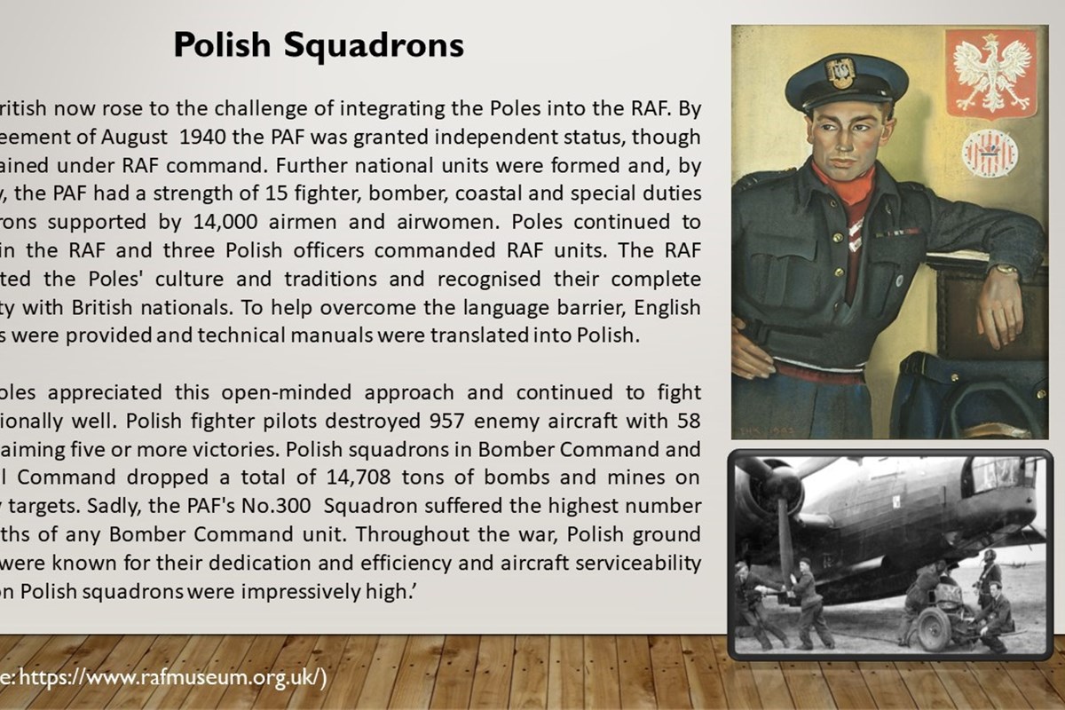 The Polish army, air force and navy made huge contributions to the allied war effort, particularly the British campaigns. The following are only a few examples of their many achievements and sacrifices during World War II. The 1st Polish Armoured Division landed in France in August 1944 and joined the Canadians to help close the Falaise Gap. The Polish air force was prodigious in their contribution during the Battle of Britain. The Polish Navy took part in the Normandy landings and escorted Atlantic convoys of ships. A great number of Polish soldiers ended up in Scotland, initially in camps in Biggar, Douglas and Crawford. Men and women (the great majority were men) who were of age were formed into military units and were stationed all over Scotland. Carry out work such as guarding in POW camps and making sea defences on the east coast of Scotland against possible Nazi invasion from Norway. Their numbers were added to, over time, by soldiers released from Soviet captivity and other members of the Polish diaspora.